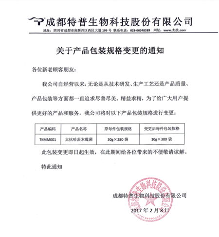 本著精益求精的工匠精神,以提高客戶(hù)滿(mǎn)意度為宗旨,同時(shí)根據(jù)市場(chǎng)需求、客戶(hù)反饋以及公司的發(fā)展需求,2月8日,公司給市場(chǎng)上各位新老客戶(hù)發(fā)出了關(guān)于太抗?哈茨木霉菌包裝變更的通知,公司生產(chǎn)部的同事們也正加班加點(diǎn)生產(chǎn),希望趕在春播前把產(chǎn)品配送到各位客戶(hù)朋友手上!