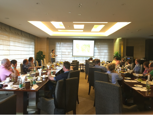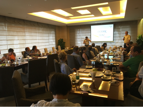 會(huì)上,董事長(zhǎng)黃永博士詳細(xì)講解了太抗系列產(chǎn)品的作用機(jī)理及各地應(yīng)用案列,得到了所有與會(huì)人員的高度關(guān)注。當(dāng)講到太抗產(chǎn)品的安全性時(shí),外賓們紛紛將在燒杯中的樣品看了又看,聞了又聞,可能實(shí)在覺得看似酸奶的生物農(nóng)藥著實(shí)稀奇。PPT放映結(jié)束后,外賓們接連提問,關(guān)于產(chǎn)品的保質(zhì)期、使用技術(shù)、投入產(chǎn)出比等等,董事長(zhǎng)一一解答,連喝水的空都沒有。其中,來(lái)自來(lái)自維多利亞州的Gary Jeans講到其種植有4000公頃有機(jī)李用于出口中國(guó),非常希望能用上太抗系列產(chǎn)品!此外,有外賓提出想帶些樣品回澳洲,也有外賓提出想和我公司澳洲研發(fā)人員深入交流,更有外賓要了黃董厚厚一疊名片說是要去澳洲幫我們做宣傳!