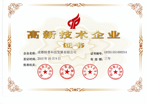 今年下半年,經(jīng)企業(yè)申報(bào)、專家評審、公示等程序,成都特普科技發(fā)展有限公司取得由四川省科學(xué)技術(shù)廳、四川省財(cái)政廳、四川省國家稅務(wù)局、四川省地方稅務(wù)局共同頒發(fā)的高新技術(shù)企業(yè)證書,證書編號:GR201551000244,發(fā)證時(shí)間2015年10月9日,有效期:三年。